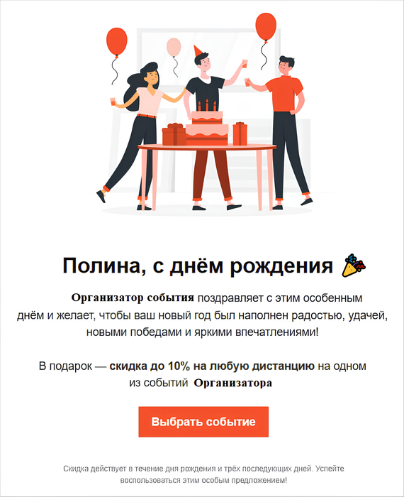 На Russia Running доступен подарок для именинников — персональная скидка на события организатора. Письмо-поздравление направляется только тем пользователям, которые уже участвовали в событиях организатора. Воспользоваться скидкой можно в день рождения и в течение 3 дней после него.