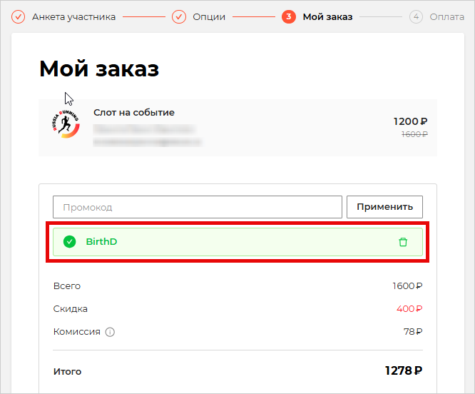 Персональная скидка действует только при регистрации из личного кабинета именинника. Если он участвует в эстафетном соревновании, скидка будет действовать только для его регистрации.