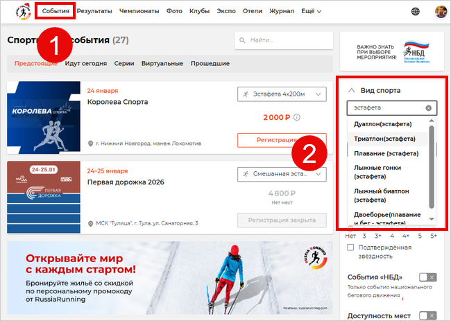 1. На сайте Russia Running в верхнем меню откройте раздел События.